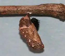 Das dunkelgrüne Ei hat helle Streifen und wird einzeln oder in kleinen Gruppen an der Nahrungspflanze abgelegt. Die Raupen sind schwärzlich und auf jedem Segment mit weißlichen und orangen Streifen versehen. Sie weisen am ganzen Körper zahlreiche feine weißliche Punkte und schwarze Dornen auf. Die helle, cremefarbene Stürzpuppe zeigt einige rotbraune Zeichnungselemente.[3]