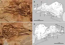 Das Zwischenkieferbein hat vier Zähne, von denen die beiden vorderen stiftförmig sind. Am Unterkiefer sind mindestens sieben Zähne erkennbar. Das Becken ist sehr breit. Der Pygostyl ist eher kurz und endet in einer scharfen Spitze.[1]