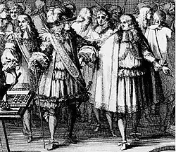 In der Folge bekam der Rock insgesamt einen körpernahen Schnitt (ohne Taille[10]), wodurch er zum Justaucorps wurde. Er wurde oft mit gestickten Streifen besetzt, mit tiefliegenden, reich umrandeten, horizontal eingeschnittenen Taschen versehen und auf einer oder beiden Schultern mit einem Bündel von Bändern geschmückt. Anfänglich pflegte man ihn, wiederum ganz nach soldatischer Weise, um die Hüften mit einer breiten, langen Schärpe zu umgürten (um ihn auch zusammenzuhalten[11]), diese zu einer bauschigen Schleife zu binden und ihre mit Kanten verzierten Enden ziemlich lang herabhängen zu lassen. Bis gegen Ende der Siebzigerjahre wurden die Ärmel länger und reichten bis zur Mitte des Unterarms, die Aufschläge bis zur Armbeuge hinauf. Der Schnitt des Rocks wurde gleichzeitig leicht tailliert.