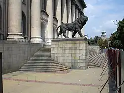 Nach der Grundrenovierung des Justizpalastes von 2001 bis 2007, wurde der vorher sehr offen und zugänglich wirkende Eingangsbereich der Frontseite (große offenen Treppe, fünf große Eingangstüren) durch massive, hohe Metallgatter auf den Treppen gesichert, was den ästhetischen Gesamteindruck der Frontseite stark beeinträchtigte und daher große Kritik hervorrief. Seitdem sind, ebenfalls aus Sicherheitsgründen, nur die mittleren drei der fünf Eingangstüren geöffnet und die große Außentreppe wird von zahlreichen (insgesamt 10), eng beieinander stehenden Geländern in Gänge unterteilt, so dass nur noch ein Zugang zu den Eingangstüren möglich ist, die Gänge dazwischen sind zusätzlich durch Ketten gesperrt, die von den Säulen hängen. Auch die schmalen seitlichen Treppen hinter dem Löwensockel wurden durch massive Gitter abgesperrt. Bevor diese Absperrungen installiert worden waren, saßen im Sommer zahlreiche Menschen auf den Treppen des Justizpalastes.