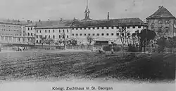 1897 wurde das 1722 errichtete Ordensschloss St. Georgen in die Anstalt integriert, das heute die Krankenabteilung mit einer Tuberkulose-Station beherbergt.[9] Als weitere örtliche Strafanstalt entstand 1870 in geringer Entfernung das Landgerichtsgefängnis. In dem reinen Zellengefängnis wurden um die Jahrhundertwende Hinrichtungen vollzogen, für die jeweils ein Fallbeil von München-Stadelheim nach Bayreuth gebracht wurde. Später exekutierte man verurteilte Mörder in der Landeshauptstadt.[4]