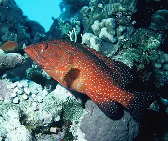 Der Juwelen-Zackenbarsch (Cephalopholis miniata) oder Juwelenbarsch ist ein bis 45 Zentimeter langer Vertreter der Zackenbarsche. Seine Farbe ist auffallend rot mit kleinen blauen Punkten.