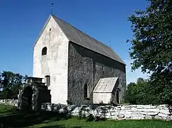 Zur hölzernen Vorgängerkirche, die 1971 bei Grabungen innerhalb der heutigen Ruine entdeckt wurde, gehörte ebenfalls ein Friedhof. Neben Spuren von verbranntem Holz wurden Gräber entdeckt, in denen nach christlichem Brauch in Ost-West-Richtung bestattet war. Als die Überfälle und Plünderungen von der Ostsee her zunahmen, wurde im Laufe des 12. Jahrhunderts ein steinerner Verteidigungsturm errichtet. Er besaß fünf Stockwerke und war höher als der erhaltene Rest. Einige Stockwerke hatten jeweils zwei Tonnengewölbe, die abwechselnd in Ost-West- bzw. in Nord-Süd-Richtung ausgerichtet waren. Ein heute noch erhaltener Eingang ist auf der Westseite des Turmes in etwa sieben Meter Höhe sichtbar. Ob eine Verbindung zwischen dem Turm und der Holzkirche bestand, ist unklar.