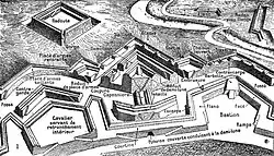 im Hintergrund Gedeckter Weg mit Waffenplatz und Palisaden vor dem Glacis