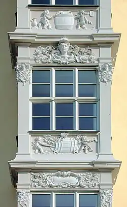 Da der Bauherr von Beruf Böttchermeister und Weinhändler war, wurden die Putten des Eckerkers als Wein- und Böttcherarbeiter dargestellt. Über dem Eingangsportal ist ein in Sandstein gefertigter Weinberg zu sehen, der von Putten bearbeitet wird. Das Portal zeigt als oberen Abschluss einen Korbbogen mit Muschel als Schlussstein, darüber eine janusköpfige Gestalt mit Schlüssel und Stab vor dem Weinberg. Der Schlussstein trug den Spruch „Sudore Benedictione“.[12]