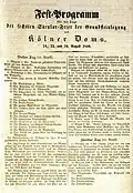 Abends lud der preußische König zu einem Festbankett in die Brühler Schlösser ein, zu dem neben dem Reichsverweser jetzt auch die Vertreter der Nationalversammlung eingeladen waren.[5] In der Stadt fand am Nachmittag und Abend ein großes Volksfest mit Volksbelustigungen mit etwa 29.000 Teilnehmern[8] statt, und der Bevölkerung wurden „20.000 Wurstbrötchen und siebzig Fuder Wein“ ausgegeben.[9] Abends wurde die festlich geschmückte Stadt bunt erleuchtet. Der dritte und letzte Tag der Festlichkeiten stand im Zeichen der Hauptversammlung des Dombauvereins. Der preußische König, der Reichsverweser und die Abgeordneten der Nationalversammlung waren inzwischen schon auf dem Heimweg. Größere Proteste gegen das Fest sind nicht überliefert, allerdings hielten demokratische Abgeordnete und der Kölner Arbeiterverein am 13. und 14. August einen Kongress als Gegenveranstaltung ab.[10]