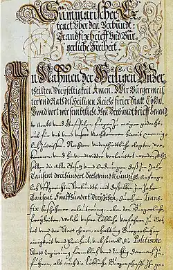 Wir, Bürgermeister und Rat der Stadt Köln, und weiter wir, die ganze Gemeinde[12] insgesamt, arm und reich, ansässig und wohnhaft in Köln, aus allen und jeglichen Ämtern[13] und Gaffelgesellschaften, die im folgenden namentlich aufgeschrieben sind: