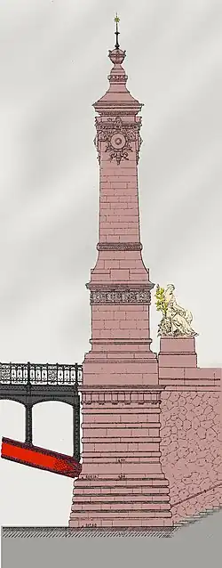 Die Auffahrten zur Brücke wurden von vier Pylonen markiert, für die eine Ausschmückung mit Skulpturen vorgesehen war. Zwischen 1897 und 1901 schuf der Bildhauer Adolf Fremd die allegorische Figuren „Landwirtschaft“, „Handel“, „Gewerbe“ und „Wehrstand“.