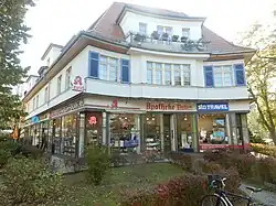 • Nummer 38: Wohn- und Geschäftshaus[12] von 1929 bis 1930, Entwurf Hans Altmann. Das zweigeschossige Eckgebäude mit hohem Walmdach steht im spitzen Winkel der beiden Straßen; es bildet mit seiner konkav geschwungenen Stirnseite einen kleinen Vorplatz und schafft so eine städtebaulich reizvolle Situation. Von den ursprünglich zehn Ladenlokalen im Erdgeschoss gibt es heute durch Zusammenlegungen nur noch sieben, darunter die am Vorplatz gelegene Apotheke Dahlem.
