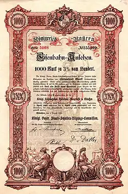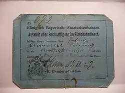 Die Königlich Bayerischen Staatseisenbahnen (K.Bay.Sts.B.) waren die Staatsbahn des Königreichs Bayern. Sie wurden 1844 gegründet. Das Unternehmen entwickelte sich bis zum Ende des Ersten Weltkrieges mit einem Streckennetz von 8526 Kilometern (einschließlich der zum 1. Januar 1909 übernommenen Pfälzischen Eisenbahnen) zur zweitgrößten deutschen Länderbahn nach den Preußischen Staatseisenbahnen. Nach dem Ende der Monarchie am 8. November 1918 entfiel im Namen das Prädikat Königlich. Auf den Grenzsteinen lautete die Bezeichnung, abweichend von der Norm, KBE für Königlich Bayerische Eisenbahn.[2]