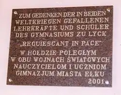 1956 wurde eine (in Vergessenheit geratene) Patenschaft mit einer Schule der Patenstadt Hagen abgeschlossen. 2001 stiftete die Kreisgemeinschaft Lyck der Schule eine Ehrentafel für die gefallenen Schüler des Zweiten Weltkriegs in deutscher und polnischer Sprache.