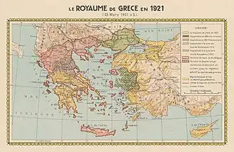 Von 1918 bis 1923 besetzte Griechenland das albanische Nordepirus und während des Griechisch-Türkischen Krieges von 1919 bis 1923 ab 1920 die türkischen Gebiete Ostthrakien und Izmir und eroberte 1923 Westthrakien. 1920 forderte das Königreich die „Rückgabe“ Istanbuls, um es als Erinnerung an das mittelalterliche Konstantinopel zur Hauptstadt zu machen. Nach dem Verlust der türkischen Gebiete wanderten viele dort lebenden Griechen in das Kernland ein und die Megali Idea zur Wiederherstellung des Byzantinischen Reiches wurde aufgegeben.[7]