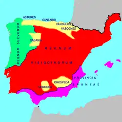 Im Jahre 416 erschienen die Westgoten auf der Iberischen Halbinsel, welche als foederati von Constantius III. geschickt worden waren, um die Barbaren, die 409 angekommen waren, niederzuwerfen. Ab dem Jahr 418 wurden die Westgoten von ihrem rex Wallia geführt. Sie griffen zunächst die Silingischen Vandalen und die Alanen an und schlugen sie vernichtend; während die Hasdinge und Sueben von Wallias Kampagne verschont blieben und als die beiden verbleibenden Kräfte auf der Iberischen Halbinsel übrigblieben.[27]