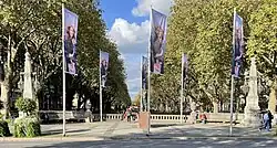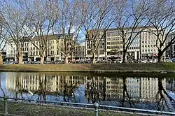 Die Königsallee, kurz Kö genannt, ist ein in nordsüdlicher Richtung verlaufender Boulevard im Stadtzentrum von Düsseldorf. Die Kö ist eine der führenden Luxuseinkaufsstraßen Europas.[1] Charakteristisch für ihre Gestaltung sind der Stadtgraben (auch Kö-Graben genannt) und der eindrucksvolle Baumbestand. Mit fast durchgehend 87 Metern ist sie, von Haus- zu Hausfassade gemessen, die breiteste Straße Deutschlands.[2] Statt der gewohnten zwei hat sie vier Gehwege – zwei an den Seiten des Grabens und je einen entlang der Häuserzeilen. Die westliche, traditionell weniger begangene Seite mit – im Nordteil – nur wenigen Läden wird auch als „Bankenseite“ oder „stille Seite“ bezeichnet.