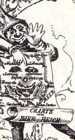 Das Königsberger Bierreich ist eine große Insel im Biermeer, in das sich ihre sechs Vorgebirge erstrecken:[A 1] Cap Gelehrter (Bierjunge mit 1 Glas Bier), Cap Doktor (mit 2 Glas), Cap Cardinal (mit 3), Cap Papst (mit 4), Cap Hai und Cap Kirchhof.[A 2] Weitab liegt (links unten) die Insel der „Bierstummen“, die 6 Ganze getrunken haben.