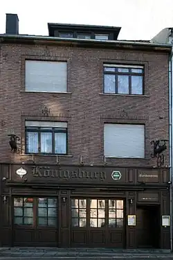 1908 ließ Heinrich Schmitz nach Plänen des Architekten Kuhlmann den Saalbau mit Rabitzgewölbe errichten. Es wurde in den ersten Jahren für Konzert-, Tanz- und Bühnenveranstaltungen genutzt. In den 1920er Jahren erfolgte der Anbau der Gastwirtschaft, der Wohnung für die Gastwirte und der Fremdenzimmer für den Hotelbetrieb. In den 1930er Jahren diente die Königsburg der NSDAP als Vereinslokal. U. a. erfolgte die Einführung des Ortsgruppenführers Josef Claßen durch den Kreisleiter Heinrich Niem 1934 hier. Nach Kriegsbeginn nutzte die Wehrmacht vorübergehend die Königsburg als Quartier und in den letzten Kriegsjahren waren deportierte Fremdarbeiter in der Königsburg untergebracht.[3] Am 16. Juni 1950 fand im Saal der Königsburg die Gerichtsverhandlung gegen sechs Bürger wegen ihrer Beteiligung an der Reichskristallnacht am 9. und 10. November 1938 statt. Zwei Angeklagte erhielten Haftstrafen, zwei fielen unter das Amnestiegesetz und zwei wurden mangels Beweisen freigesprochen.[4]