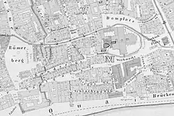 Im Zuge des Humanismus erwachte zu Beginn der frühen Neuzeit auch in Frankfurt am Main allmählich ein Interesse am Ursprung der Stadt und die Suche nach der urkundlich erwähnten Pfalz, beginnend mit dem Stiftsdekan und Historiker Johannes Latomus im Jahr 1562.[53] Das seinerzeit einzige, besonders altertümlich wirkende und frei stehende Bauwerk im Zentrum der Altstadt war jedoch offenbar der Saalhof, den er folglich mit dem Bau Ludwigs des Frommen gleichsetzte.[54]