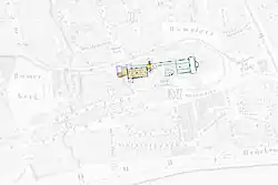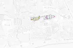 Die Innenmaße der Kirche betrugen 29,80 Meter Länge bei 22,20 Metern Breite.[35] Die Ostapsis wies mit 7,20 Metern exakt dieselbe Breite wie das Mittelschiff auf,[36] die Seitenschiffe dürften etwa 4,20 bis 4,30 Meter breit gewesen sein. Eine Trennung von Mittel- und Seitenschiffen durch Pfeilerreihen gilt durchaus als gesichert, über ihre Anzahl und Ausformung kann jedoch nur spekuliert werden, da hierzu bisher keine archäologischen Funde gemacht werden konnten.[37]