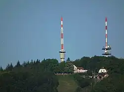 - Auf dem Gipfel wurde 1832 mit dem Bau eines ersten, achteckigen Aussichtsturms begonnen, der 1835 eingeweiht und an den dann 1911 außen ein Aufzug angebracht wurde.[10] Nach Fertigstellung des Fernsehturms wurde das Bauwerk abgerissen.[11][12]