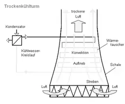In Trockenkühltürmen kommt das Wasser nicht in direkten Kontakt mit der Atmosphäre. Bei ihnen strömt das Kühlwasser in Rohren, die mit Kühlrippen ausgestattet sind. Die Umgebungsluft strömt an den Kühlrippen vorbei, wird erwärmt, steigt durch Konvektion auf und transportiert damit die übertragene Wärme ab. Große Ventilatoren können die Konvektion unterstützen.