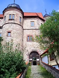 - Das weit sichtbare Wahrzeichen des Orts ist die Johanniterburg Kühndorf. Sie wurde zwischen 1291 und 1315 durch Ritter vom Orden des heiligen Johannes erbaut und ist die einzige im deutschen Sprachraum erhaltene Johanniterburg aus dem 13. Jahrhundert sowie das einzige private Objekt der Burgenstraße Thüringen. Im Sommerhalbjahr von März bis Oktober ist mittwochs bis samstags, sonst auf Anfrage die Besichtigung der Burg möglich; zudem wird von März bis Oktober samstags eine Führung angeboten. In der privaten Burg befinden sich außerdem Zimmer und Ferienwohnungen sowie Veranstaltungsräume. Inhaber der Burg ist die Familie derer von Eichborn.[5]