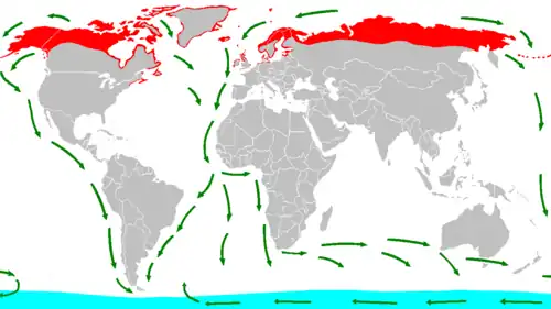 Die Küstenseeschwalbe ist der Zugvogel mit dem längsten Zugweg. Ihre Winterquartiere liegen am Rand der antarktischen Packeiszone zwischen dem 55. und 70. südlichen Breitengrad im Süden des Atlantischen- und Indischen Ozeans, in der Weddell-See und vor der Antarktis. Die Vögel legen auf ihrem Zug von den arktischen Brutplätzen in die antarktischen Überwinterungsgebiete und retour eine Strecke von bis zu 30.000 km zurück – fast einmal um die Erde. Jüngere Forschungen ergaben, dass einzelne Individuen bis 90.000 km in einem Jahr zurücklegen.[5][6] Eines von 29 mit Sensoren ausgestatteten Tieren von den Farne-Inseln legte innerhalb von 10 Monaten einen Weg von 96.000 km zurück.[7][8]