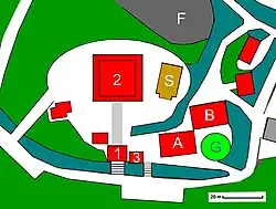 Zum etwas unterhalb gelegenen Abtquartier (A) mit dem Refektorium (庫裏 Kuri; B) gehört ein kleiner Garten (G) im klassisch-japanischen Stil. Auf der Höhe über dem Tempel liegt der Friedhof (F).
