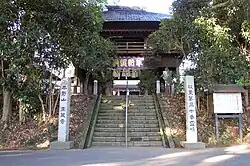 Man betritt den an einem Berghang gelegenen Tempel von Süden her durch das Tempeltor aus der Edo-Zeit, das hier als Niō-Tor (仁王門 Niō-mon; 1 im Plan), also als Tor mit den beiden Tempelwächtern (Niō) rechts und links vom Durchgang, ausgeführt ist. Man passiert das niedrige Gehäuse für die Tempelglocke (鐘楼 Shōrō), ebenfalls aus der Edo-Zeit. Die Tempelglocke wurde während des Pazifikkriegs eingeschmolzen, wurde 1972 mit Hilfe von Spenden nachgegossen. Nun hat man die große Haupthalle (本堂 Hondō; 2) vor sich. Sie stammt aus dem Jahr 1526, als der Tempel wieder aufgebaut wurde, ist an der Vorderseite 9 Ken (etwa 16 m) breit. Die Halle steht auf einer hohen Basis und hat ein Doppeldach. 1928 brach das obere Dach ein und musste ersetzt werden.