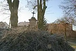- Johannes von Nepomuk-Denkmal mit gusseisernem Kreuz, auf dem Dorfplatz, errichtet 1854