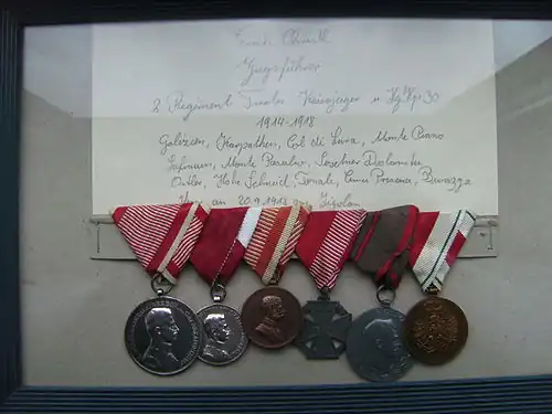 Die auf dem Bild ersichtlichen Ehrenzeichen und handschriftlichen Vermerke eines Zugsführers der Kaiserjäger zeugen von den Einsätzen während des Ersten Weltkrieges: Dieser Kaiserjäger (später Hochgebirgs-Kompanie Nr. 30) kämpfte: