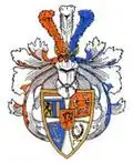 Der Halbrundschild trägt den Zirkel. Der Stechhelm über dem Wappen enthält als Helmzier drei Straußenfedern in den Verbindungsfarben.