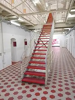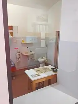 Einbauten aus der bundesrepublikanischen Zeit wurden entnommen und beispielsweise Anstriche im Bestandstreppenhaus auf der Grundlage von Farbbefunden wiederhergestellt. Auf jedem der drei Obergeschosse wurde eine sogenannte Schauzelle hergerichtet, die Zellenausstattungen in der Freikaufhaft (1. Obergeschoss), der MfS-Untersuchungshaft (2. Obergeschoss) beziehungsweise der NS-Zeit (3. Obergeschoss) vergegenwärtigen.[78]