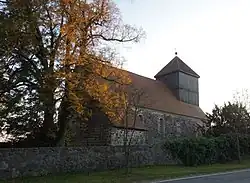- Die aus der 2. Hälfte des 13. Jahrhunderts stammende Dorfkirche ist eine Saalkirche aus Feldsteinen. Im Jahr 1728 wurde die Kirche umgebaut und erweitert. Der Kirchturm aus Backstein (1728) trägt einen verbretterten Aufsatz.[2]