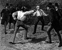 Nachdem Georges Boulanger bei einer Nachwahl in die Abgeordnetenkammer gewählt worden war, kam es nach einem Wortgefecht zwischen Floquet und Boulanger zu einem Duell, bei dem Floquet Boulanger am Hals verletzte.[2] Sein Abgeordnetenmandat legte Boulanger am 12. Juli 1888 nieder.[4] Sein Versuch, ein neues Mandat im Département Ardèche zu erringen, scheiterte.[5] Am 19. August siegte er allerdings in drei Nachwahlen in den Départements Charente inférieure, Somme und Nord.[4] Die Boulanger-Krise erlebte einen Höhepunkt, als Boulanger bei einer Nachwahl in Paris am 27. Januar deutlich siegte (245.000 Stimmen gegenüber 162.000 für den zweitplatzierten Kandidaten). Als ihn seine Anhänger aufforderten, an ihrer Spitze zum Élysée-Palast zu marschieren und die Macht zu übernehmen, lehnt er ab – er verbrachte den Abend lieber mit Madame de Bonnemains, seiner Geliebten.[6][7]