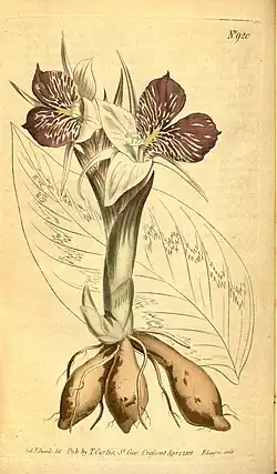 - Gewürzlilie (Kaempferia galanga L., Syn.: Kaempferia procumbens Noronha nom. nud., Kaempferia humilis Salisb., Kaempferia plantaginifolia Salisb., Kaempferia latifolia Donn ex Hornem., Kaempferia marginata Carey ex Roscoe, Kaempferia rotunda Blanco nom. illeg., Kaempferia galanga var. latifolia (Donn ex Hornem.) Donn): Sie ist in Indien, Sri Lanka, Laos, Thailand, Java und auf den Philippinen verbreitet.[2][6]