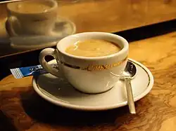 Kaffee (Standardaussprache in Deutschland: [];[1][2] in Österreich und in der Schweiz: [][1][3] ; umgangssprachlich in Norddeutschland auch [][4] ; von arabisch قهوة qahwa für „anregendes Getränk“[5][6]) ist ein je nach Röstgrad braunes bis schwarzes, psychotropes, diuretisch wirkendes,[7] coffeinhaltiges Getränk, das aus gerösteten und gemahlenen Kaffeebohnen, den Samen der Frucht der Kaffeepflanze, und heißem bzw. kaltem Wasser hergestellt wird.