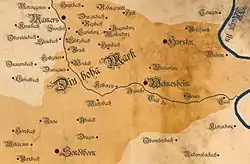 - ↑ Der Grenzverlauf der historischen Territorien kann stark abweichend dargestellt sein. Die Zugehörigkeit einiger Dörfer konnte nicht exakt nachgewiesen werden. Die Ortsnamen wurden in ihrer heutigen Namensform eingetragen.
