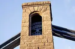 Die Pylone sind als große Portale im wilhelminischen Stil ausgebildet. Ihre aus Klinkermauerwerk bestehenden und mit Granitquadern verkleideten Türme stehen auf Betonfundamenten und sind durch steinerne Bögen verbunden. Sie enden heute mit der Einhausung der Lager für die Zugbänder auf einer Höhe von 19,5 m. Ursprünglich trugen sie gemauerte Helme und waren 25,5 m hoch, die Helme wurden nach dem Krieg jedoch nicht wieder erneuert. Auf den Pfeilerschäften ist ein vom Jugendstil beeinflusstes steinernes Relief mit dem Breslauer Stadtwappen angebracht. Das Relief mit dem Reichsadler am anderen Turm wurde nach dem Krieg entfernt. Die Verbindungsbögen trugen ursprünglich den Namen der Brücke sowie eine stilisierte Kaiserkrone[6] auf der einen und das Hohenzollernwappen auf der anderen Seite. Beides wurde samt dem angedeuteten Dach des Bogens entfernt. Die Portale vermitteln dadurch heute einen nüchternen und seltsam gedrungenen Eindruck.