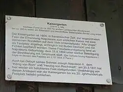 Anders als der Kaisergarten in Wollmesheim in der Pfalz (Region)[45] datiert die Gemeinde Gornhausen[46] an der Mittelmosel ihre Anlage in die Zeit der Reichsgründung 1871 und der Proklamation Kaiser Wilhelm I. In Wollmesheim soll er auf Veranlassung Kaiser Napoleons I. zum freudigen Ereignis der Geburt seines ersten Sohnes Napoleon Franz Bonaparte im Jahre 1811 per Zirkularschreiben vom 9. November 1811[47] an die Bürgermeister der französischen Mairen errichtet worden sein. Auch in Zeltingen-Rachtig wird die Anlage in die Preußische Zeit datiert und in Zusammenhang gebracht mit der Reichsgründung 1871. Im selben Jahr soll die Gemeinde auch 310 Taler für die Veranstaltung einer Siegesfeier bereitgestellt haben.[48] Als 1794 die französischen Revolutionstruppen die Rheinlande besetzten, wurde der Moselraum eingegliedert in das Saardepartement und blieb unter französischer Verwaltung bis zum Sieg der Großen Allianz über die Napoleonischen Truppen im Jahre 1815. Die territoriale Neuordnung infolge der Beschlüsse des Wiener Kongresses im Jahre 1815 führte dazu, dass der Moselraum Preußische Rheinprovinz wurde. Auffällig ist jedoch, dass diese Kaisergärten oft weit außerhalb der Ortschaften angelegt wurden. Eine von Rudolf Wild veröffentlichte Beschreibung zum Krönungsgarten in Wollmesheim bei Landau aus dem Jahre 2007 liefert hierzu die mögliche Erklärung. Sie bezieht sich darauf, dass in den von den französischen Revolutionstruppen besetzten Rheinlanden (1794–1815) zur Feier der Kaiserkrönung Napoleons I. am 2. Dezember 1804 vielerorts Grünanlagen angelegt wurden bzw. werden mussten, die Napoleonsbusch heißen sollten. Anlass war die Geburt des ersten Sohnes und des legitimen Thronfolgers von Napoleon I. am 20. März 1811. Nach Wild war genau geregelt, wer wie viele Bäume pflanzen durfte. Die Verordnung erging mit einem Cirkularschreiben vom 9. Juli 1811[49] an die Herren Maires (Bürgermeister). Der Name Napoleonsbusch soll sich in vielen Gemeinden aber nicht durchgesetzt haben und es kam zu |den Bezeichnungen Krönungsgarten, Napoleonsgarten oder Kaisergarten. Auch der ehemalige Kaisergarten bei Lambrecht in der Pfalz, dessen Anlegung mit der Kaiserkrönung Napoleons I. in Verbindung gebracht wird, folgt diesem Muster. Dass die napoleonischen Kaisergärten weit außerhalb des Ortskerns angelegt wurden, wird darauf zurückgeführt, dass viele Gemeinden nur widerwillig dem Aufruf zur Anlage des Gartens gefolgt waren. Ungern stellten sie dafür eine Fläche zur Verfügung, die auch landwirtschaftlich nutzbar war. Und so wurden häufig Standorte gewählt, die nur schwer zu bewirtschaften waren. Das waren oft auch „dreieckige Grundstücke“, was diesen oft den Namen Napoleonshut einbrachte.[50]