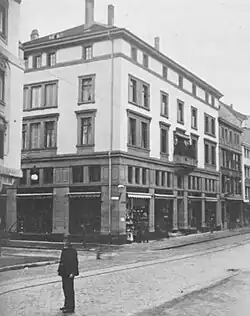- Nr. 23 und 23a erhielt unter Bäckermeister Franz Bolch eine neue Fassade, die Werkmeister Martin Keppeler entwarf. Bis 1944 befand sich in Nr. 23 das Maßatelier Heinrich Hochheimer.[40] 1938 hatte der Zahnarzt Franz Willscheid seine Praxis in dem Gebäude und behandelte darin den thailändischen König Ananda Mahidol.[41] 1961 wurde das Gebäude vom Bürobedarfshaus Fegert-Staiger genutzt, außerdem betrieb Eduard Vock darin die Pfandleihanstalt K. Stahl.