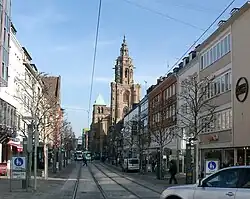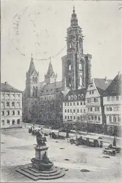 - Die Kilianskirche in der Kaiserstraße 38 ist eine gotische Hallenkirche, deren Ursprung mindestens bis in das 11. Jahrhundert zurückreicht. Ihr Westturm von Hans Schweiner gilt als eines der ersten bedeutenden Renaissancebauwerke nördlich der Alpen.[72] Die Kirche wurde wie die umliegenden Gebäude am 4. Dezember 1944 auch weitgehend zerstört, aber bis in die 1970er Jahre in ihrer ursprünglichen Gestalt wieder aufgebaut.