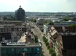 - Das Haus Kaiserstraße 29 war auf einer Teilfläche des abgebrochenen Bandhauses des Württemberger Zehnhofs durch die Architekten Maute & Moosbrugger errichtet worden. Es gehörte zunächst der Firma Koch und Mayer, später der Firma Saemann bzw. Lina Saemann. 1931 befand sich darin das Möbel- und Bettengeschäft Max Lang.[58] Bis zur Zerstörung 1944 war dort die 1902 gegründete Papier- und Schreibwarengroßhandlung C. Josef Müller (Inh. Carl Mollenkopf) ansässig.[59] 1950 waren an dieser Adresse das Sporthaus Saemann, die Färberei und Reinigung Gerock, Zigarren-Bauer, Reklame-Woerner, ein Büro der Wohnungsbau-Genossenschaft Schwaben, der Rechtsanwalt Haasis, der Steuerberater Willy Bauer und der Detektiv Wolter gemeldet. 1961 firmierte dort neben Saemann, Gerock und Zigarren-Bauer noch der Zahnarzt Burau.