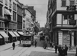 - Nr. 33 beherbergte zu Beginn des 20. Jahrhunderts die Firma Carl Wolf.[68] Später waren darin die Hauptverkaufsstelle der Firma Tengelmann, die nach der Zerstörung 1944 in die Wilhelmstraße 25 wechselte, 1952 dann jedoch am alten Platz wiedereröffnet wurde,[69] sowie das Schuhhaus Walch, das 1955 in dem Gebäude seine umgebauten Ausstellungsräume eröffnete.[70] Büros im Gebäude waren 1950 vermietet an den Orthopädie-Schuhmachermeister Arnold, an die Eos-Excelsior-Versicherung, an die Subdirektion der Vereinigte Krankenversicherung AG (VKV), an den Rechtsanwalt Lambert und den Zahnarzt Mahler. Bis auf Rechtsanwalt Lambert waren diese Parteien auch 1961 noch dort gemeldet.