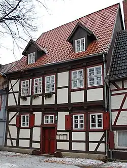 Das Fachwerkhaus entstand um 1680. Es wird durch ein sehr hohes Dach geprägt. Die Fachwerkfassade ist mit Pyramidenbalkenköpfen, stilisierten Schiffskehlen und profilierten Füllhölzern verziert.
