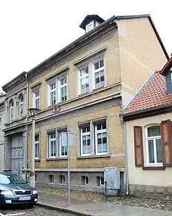 Das zweigeschossige in massiver Bauweise errichtete Gebäude entstand im Stil des Spätklassizismus. Die Fassade präsentiert sich als Klinker-Putzfassade. An der Ostseite besteht eine Tordurchfahrt. Das Tor selbst ist mit einem Sonnenmotiv verziert.