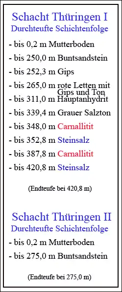 1978 wurde der Schachtgrund im Schacht Thüringen II bei 4,08 m unter NN angelotet. Der Wasserspiegel stand bei 80,80 m unter Flur. Selbst eine Wasserprobe aus einer Teufe von 223,13 m zeigte eine unwesentliche Versalzung (alle Werte in g/l: CaSO4=0,41, MgSO4=0,12, MgCl2=0,09, NaCl=0,30).