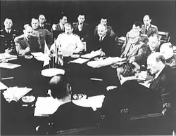 Auf der Konferenz von Jalta im Februar 1945 zeigten sich erste Risse in der Anti-Hitler-Koalition: Roosevelt lehnte angesichts der sich abzeichnenden sowjetischen Vorherrschaft in Osteuropa konkrete Vereinbarungen mit der Sowjetunion für die Nachkriegszeit ab. Daraufhin änderte Stalin seinen Kurs und ging verstärkt daran, sowjetische Sicherheitsinteressen in den von ihm kontrollierten Gebieten ohne Rücksprache mit den Westalliierten durchzusetzen.