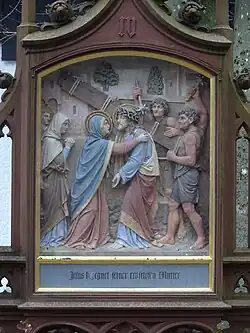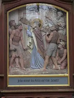 Ab 1890 entstanden die 14 Kreuzwegstationen nach Entwürfen des Architekten Johann Marggraff. Die Reliefs wurden von den Bildhauern Gebrüder Preckel aus Stadtamhof geschaffen und erneut von Pfefferle farblich gefasst. Papst Leo XIII. gewährte einen Ablass für die Absolvierung des Kreuzweges, der schließlich am 28. August 1892 vom Provinzial der Bayerischen Franziskanerprovinz, Petrus von Hötzl, geweiht wurde; von Hötzl wurde 1895 Bischof von Augsburg. Die Stationen kosteten insgesamt 7700 Mark, die von privaten Spendern übernommen wurden. Darunter waren Kaiserin Elisabeth von Österreich-Ungarn (Station XII) und Albert von Thurn und Taxis (Station XIII).[1]