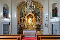 Vom Vorplatz führt eine Freitreppe zur Eingangskapelle, der sogenannten Gnadenkapelle, die ursprünglich Getsemani- bzw. Ölbergkapelle hieß. Den Treppenbeginn und das Rundbogenportal der Vorhalle flankieren je zwei Engelfiguren. Neben der Tür zur Kapelle stehen die „Bauernheiligen“ Donatus und Leonhard. In der Kapelle steht vor der figürlich dargestellten Ölbergszene, der ersten Station des Kreuzwegs, ein Marienaltar mit einer Kopie des Gnadenbildes Maria Einsiedeln unter einem reich verzierten Baldachin über dem Säulentabernakel. Des Weiteren enthält die Kapelle die Ölgemälde „Geburt des Herrn im Stall von Bethlehem“ und „Anbetung der Könige“ sowie eine kleine historische Orgel aus dem Jahre 1820.[1]