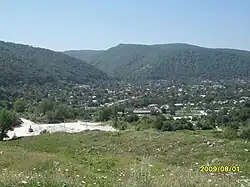 Die Siedlung liegt etwa 35 km Luftlinie südlich der Republikhauptstadt Maikop zu beiden Seiten des Kuban-Nebenflusses Belaja im Bereich des Felsenkammes (Skalisty chrebet) am Nordrand des Großen Kaukasus, der südöstlich des Ortes Höhen von über 1000 m erreicht.